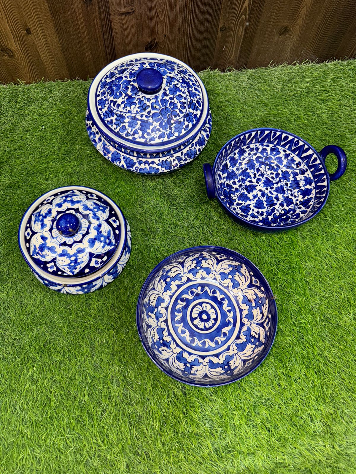 Each bowl from this handcrafted Multani Blue Pottery set celebrates centuries-old craftsmanship. Adorned with cobalt and turquoise floral motifs, these pieces bring a timeless touch of heritage to your table. Perfect for serving dry fruits, desserts, or as decorative accents, every bowl is made using eco-friendly clay and traditional glazing techniques ensuring durability, shine, and cultural beauty in every curve.